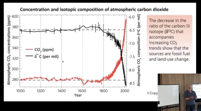 Die Verantwortung der Menschheit für den Anstieg der Temperaturen ist durch die Messung von Kohlenstoffisotopen eindeutig belegt. Fossile Ressourcen enthalten aufgrund ihres Alters keinen radioaktiven Kohlenstoff C14 und deutlich weniger des stabilen Isotops C13. Die Abnahme der relativen C13-Konzentration in der Atmosphäre seit 200 Jahren beweist, dass der verbrannte Kohlenstoff aus der Erde stammt. Die moderne Erwärmung ist komplett menschengemacht.