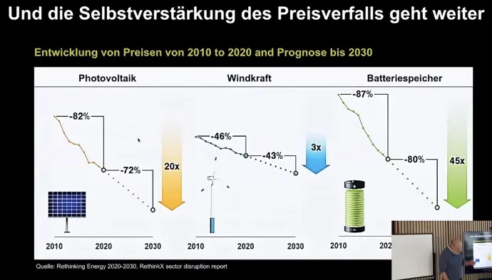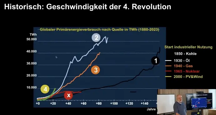 Der technologische Fortschritt geht vom Verbrennen über thermische Emission hin zu Quantentechnologie, die Wärme komplett vermeidet (z.B. LEDs statt Glühlampen). Ein Umstieg auf Technologien, die Quantenmechanik nutzen (wie Photovoltaik und Elektromotoren), führt zu einer gewaltigen Effizienzsteigerung und reduziert den Primärenergieverbrauch. Im Gegensatz zum zentralen Kraftwerksbau (Kernkraftwerke), der teuer und unflexibel ist, ermöglicht der dezentrale Bau erneuerbarer Anlagen eine steile Lernkurve und sinkende Preise. Deutschland importiert jährlich Primärenergie (Öl, Gas, Kohle) im Wert von rund 100 Milliarden Euro, wovon der Großteil als Abwärme verloren geht. Um gesellschaftliche Veränderungen zu bewirken, müssen lediglich 3,5 bis 4 % der Bevölkerung aktiviert werden, was einen sozialen Kipppunkt auslösen kann. Der wichtigste Gamechanger für die Energiewende ist die Batteriespeichertechnologie, deren Preisentwicklung rapide abnimmt.