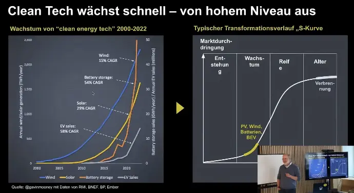 Für die Verursachung des CO2-Anstiegs ist eindeutig der Mensch verantwortlich. Isotopenmessungen sind der klare Beweis. Die Nutzung fossiler Energieträger im Vergleich zur exponentiellen Wachstumsdynamik erneuerbarer Energien wie Photovoltaik ist total ineffizient. Soziale Kipppunkte und die Notwendigkeit von Investitionen in Batteriespeicher und Dezentralisierung gelten als Schlüssel zur erfolgreichen Energiewende.
