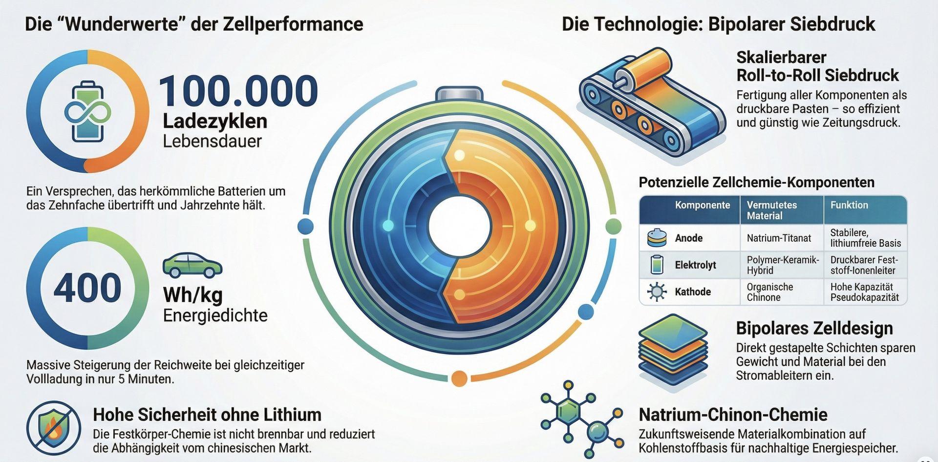 - Kostengünstige Massenproduktion: Das spezielle Siebdruckverfahren ermöglicht eine Skalierbarkeit, die mit dem „Drucken von Zeitungen“ verglichen wird. Dies könnte Batterien deutlich günstiger machen als die Produktion in heutigen, energieintensiven Gigafactories.
