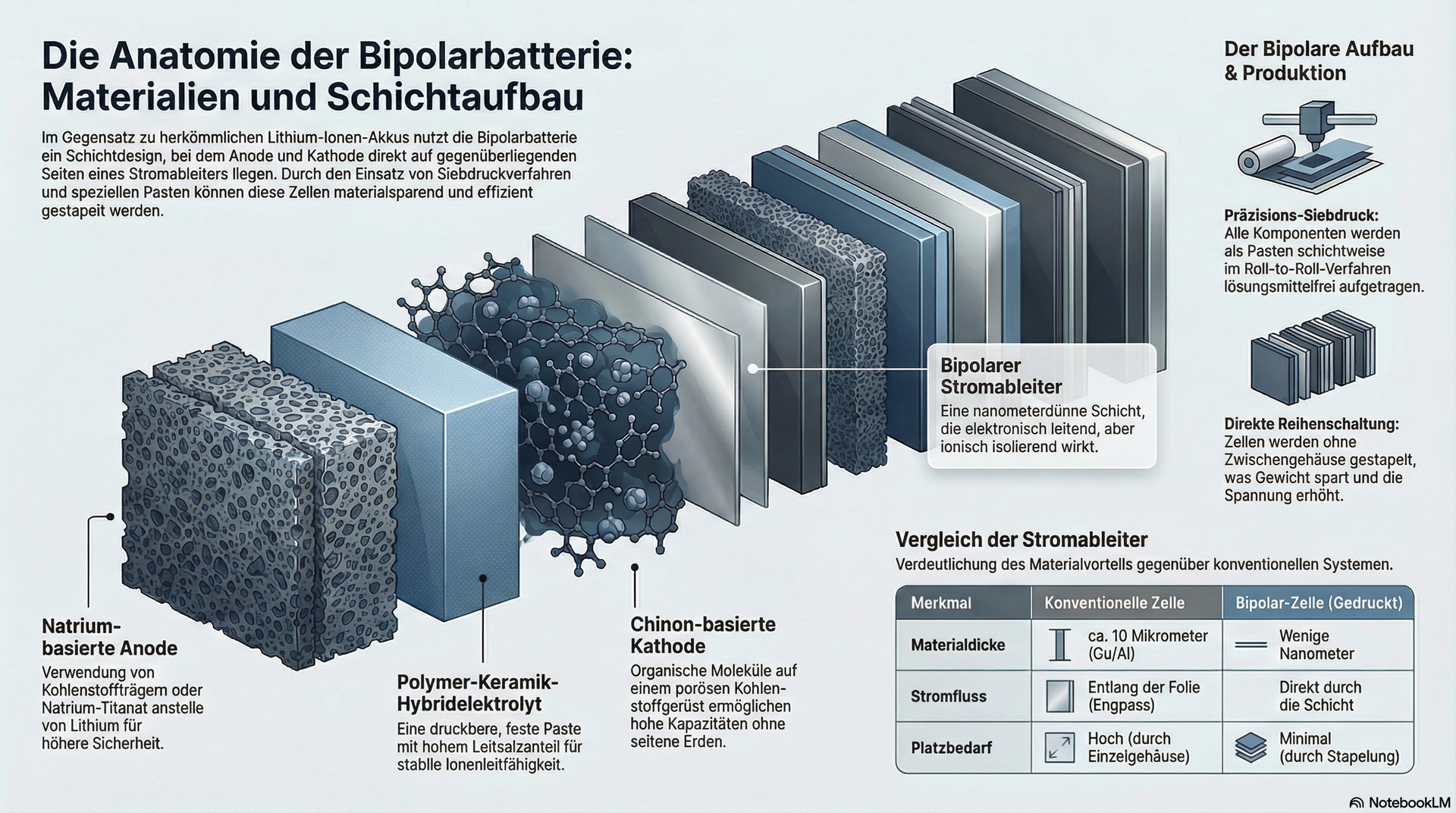 - Materialeinsparung: Im bipolaren Aufbau mit einer natriumbasierten Chemie kann der Stromableiter theoretisch auf eine Dicke von wenigen Nanometern reduziert werden, da er nur noch die Ionen trennen und Elektronen leiten muss, statt als stabile Trägerfolie zu dienen.
