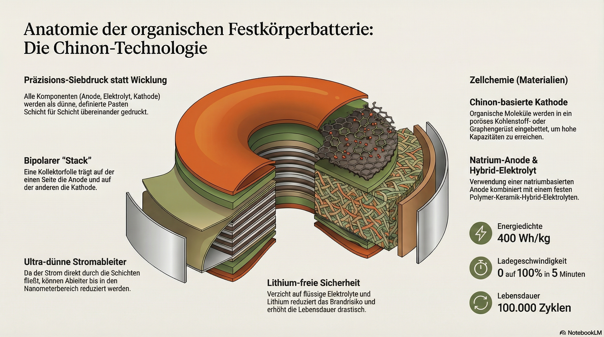 - Alternative Rohstoffe: Anstelle von Lithium wird über eine natriumbasierte Anode (z. B. aus Kohlenstoff oder Natrium-Titanat) und eine Kathode auf Basis organischer Moleküle (Chinone) spekuliert. Chinone könnten hohe Kapazitäten bieten, lösen sich jedoch in flüssigen Elektrolyten auf – ein Problem, das durch den Einsatz in einer Feststoffzelle umgangen wird.