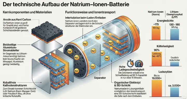 Technischer Aufbau und Funktionsweise von Natrium-Ionen-Batterien.