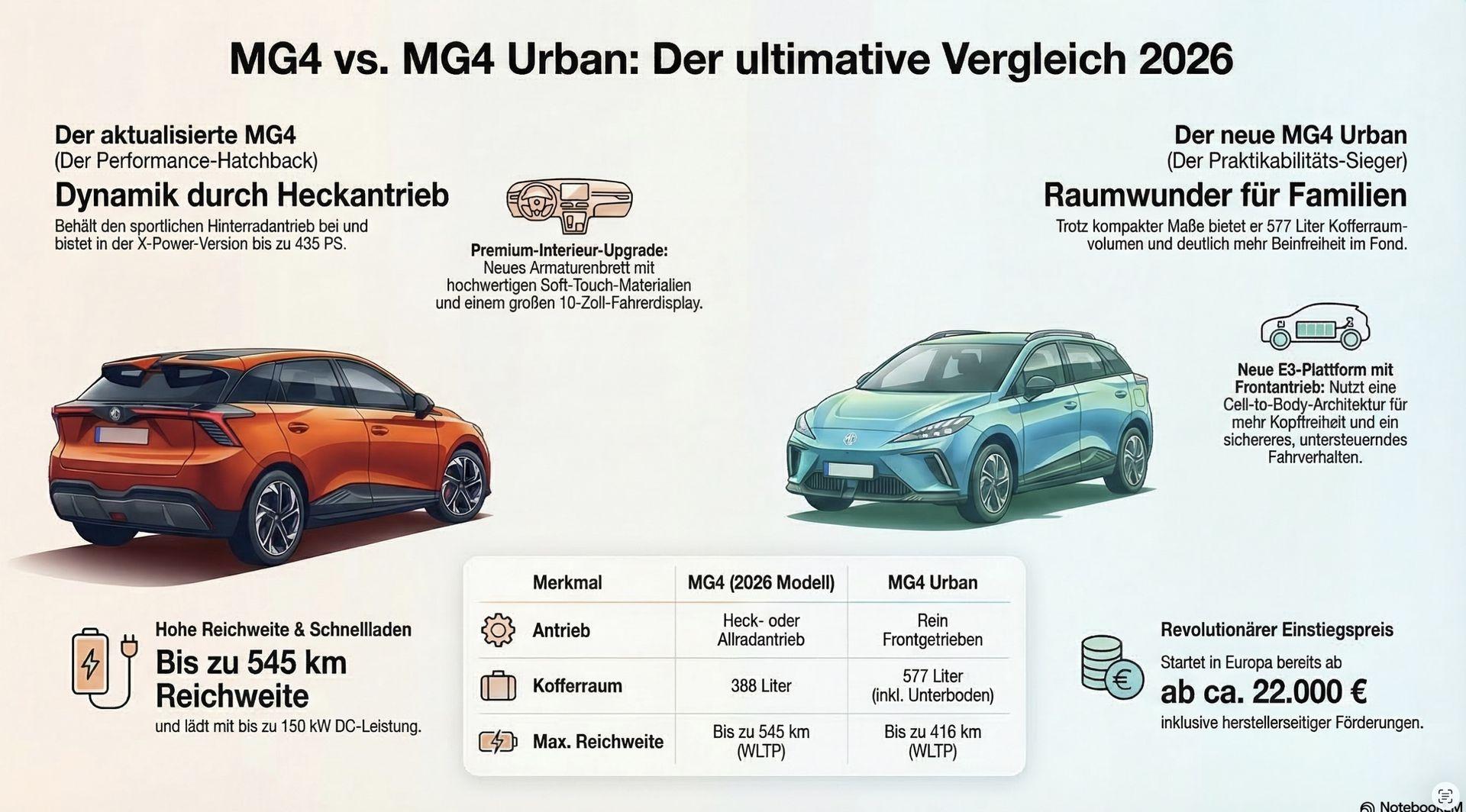 Für das Jahr 2026 verfolgt MG eine Doppelstrategie und teilt die MG4-Modellreihe in zwei unterschiedliche Fahrzeuge auf: den überarbeiteten klassischen MG4 und den komplett neuen, preisgünstigeren MG4 Urban.