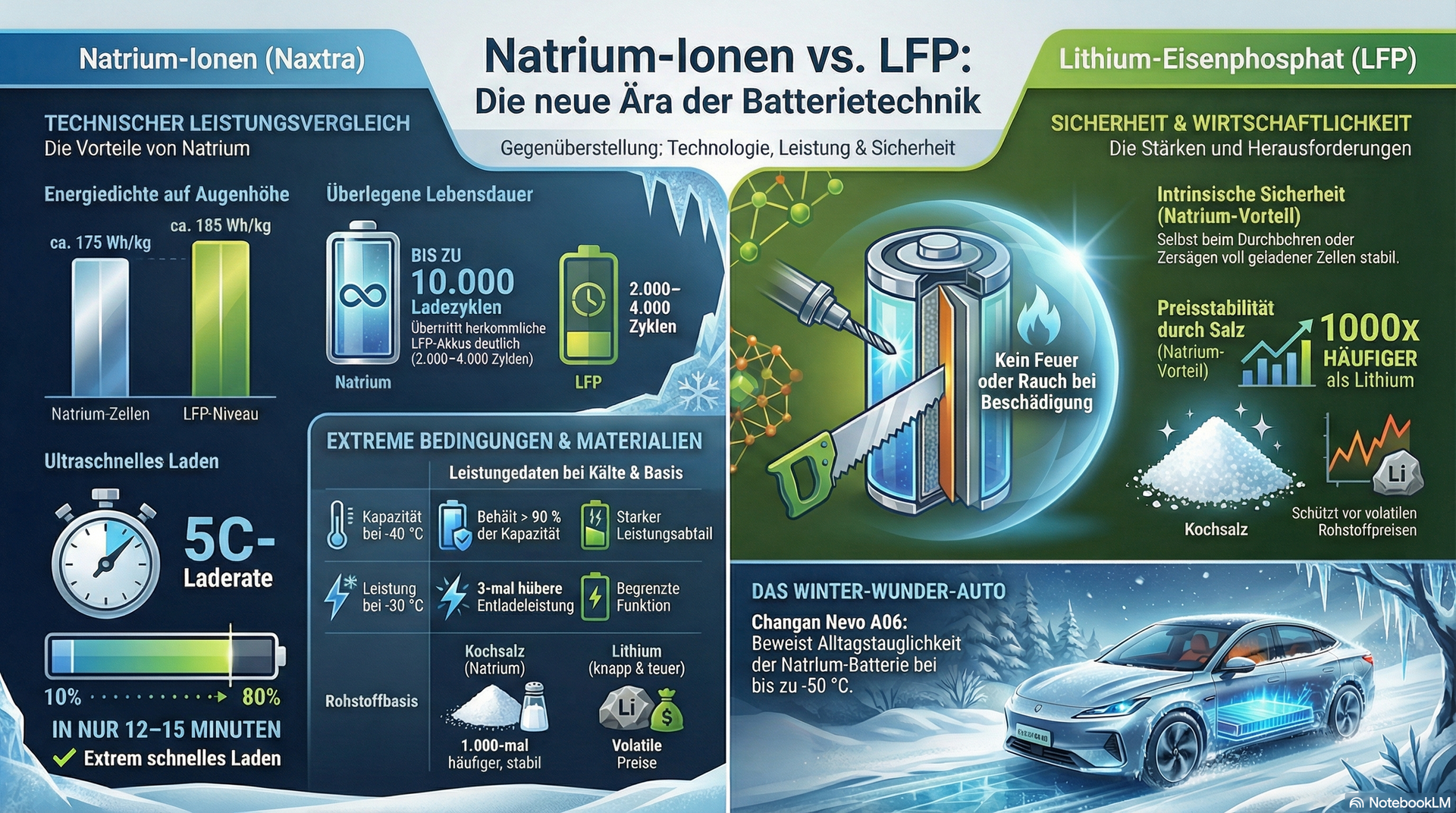 Natrium-Ionen-Batterien (Na-Ion), wie die im Changan Nevo A06 verbaute „Naxtra“-Technologie von CATL, bieten signifikante Vorteile gegenüber herkömmlichen Lithium-Ionen-Akkus (insbesondere LFP- und NMC-Batterien). Die Hauptvorteile lassen sich in vier Kernbereiche unterteilen: