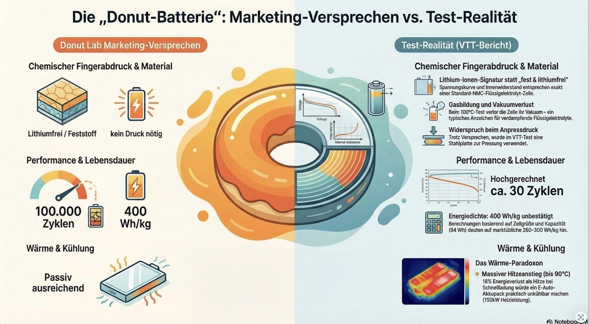 Die Behauptung von Donut Lab, ihre Batterie sei lithiumfrei, wird von Experten aufgrund massiver technischer Unstimmigkeiten in den veröffentlichten Testdaten des Instituts VTT stark angezweifelt. Die vorliegenden Quellen identifizieren mehrere Punkte, an denen die physikalischen Messwerte den Marketing-Aussagen widersprechen.
