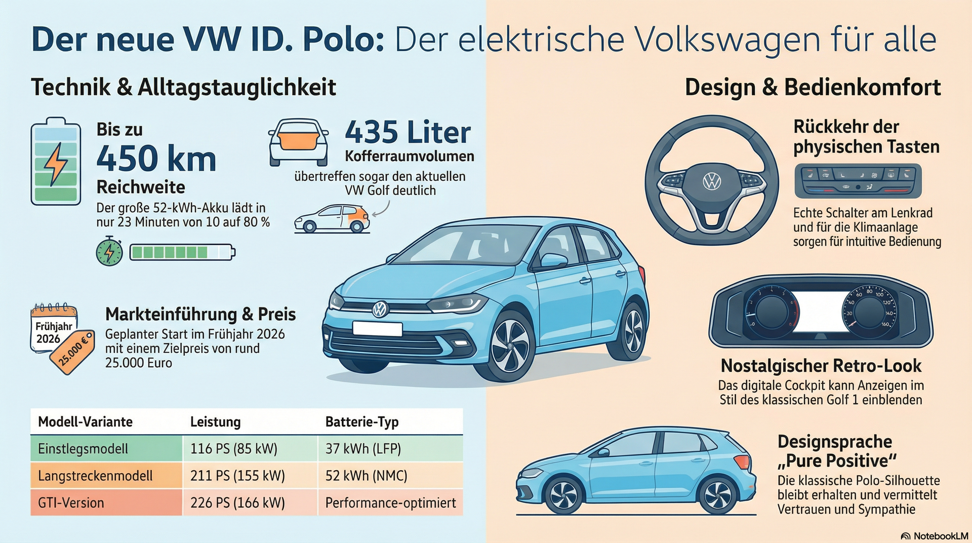 Als erschwingliches Einstiegsmodell in die Elektromobilität ist der neue VW ID.Polo für jedermann zugänglich. Das Fahrzeug bricht mit bisherigen Designkonventionen der ID-Serie, indem es auf bewährte physische Tasten sowie ein charmantes Retro-Design im Innenraum setzt. Trotz seiner kompakten Außenmaße bietet der Wagen durch den neuen Frontantrieb überraschend viel Platz im Interieur und einen Kofferraum, der sogar den aktuellen VW Golf übertrifft. Technisch überzeugt das Modell in der Top-Version mit einer Leistung von 211 PS und einem modernen Fahrgefühl, das unter anderem One-Pedal-Driving ermöglicht. Mit einem geplanten Startpreis von unter 25.000 Euro markiert der ID.Polo eine strategische Neuausrichtung von Volkswagen im Kleinwagensegment. Der Beitrag dient zugleich als emotionaler Abschied der Moderatoren, da es die finale Folge ihres langjährigen Videoformats markiert.