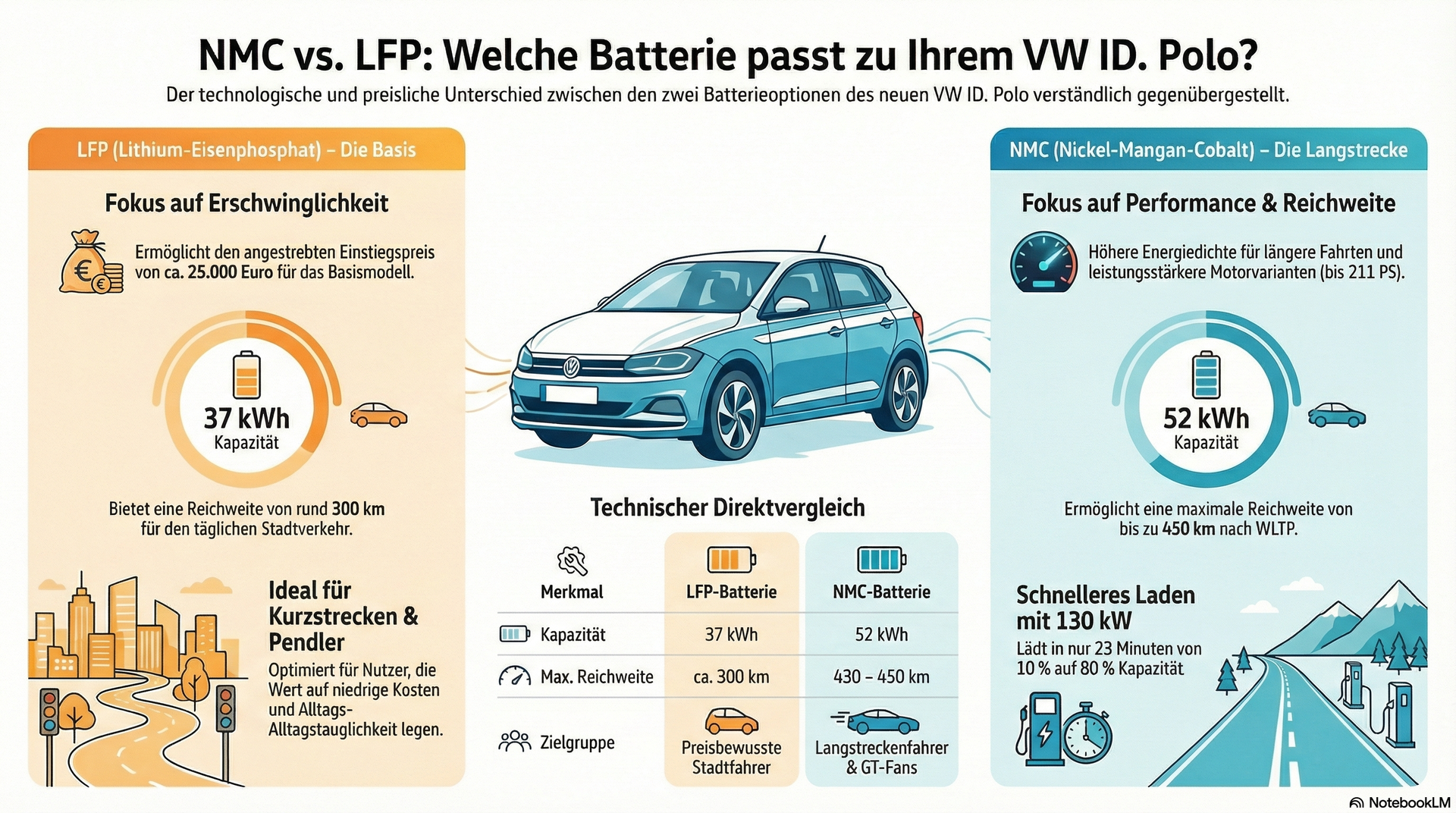 Der Hauptvorteil der LFP-Batterie (Lithium-Eisenphosphat) gegenüber der NMC-Batterie (Nickel-Mangan-Cobalt) liegt beim VW ID. Polo in den geringeren Kosten, was einen niedrigeren Einstiegspreis für das Fahrzeug ermöglicht.