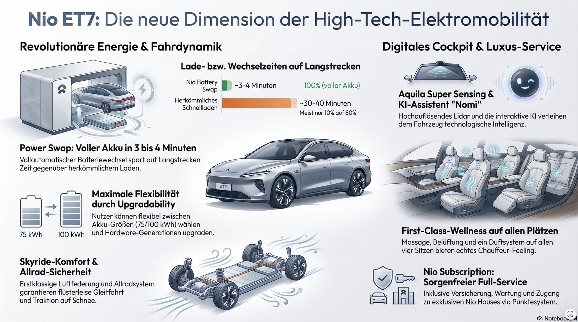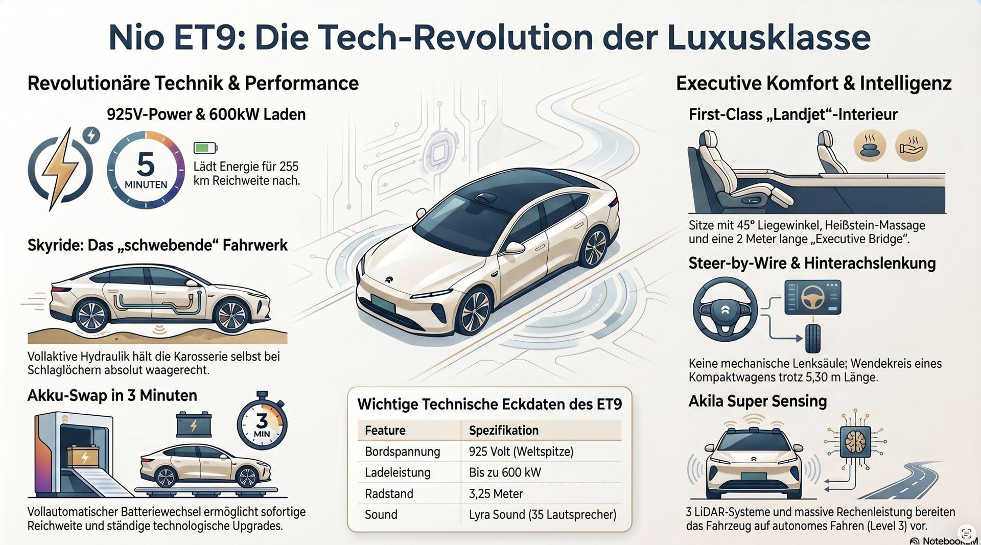 Konzipiert als Luxusfahrzeug für Führungskräfte, nutzt der ET9 eine fortschrittliche 900-Volt-Architektur. Seine Mikropixel-LED-Scheinwerfer können Muster wie Fussgängerüberwege direkt auf die Strasse projizieren. Im Inneren erwartet die Passagiere eine Executive-Konfiguration mit 24-fach verstellbaren Sitzen inklusive Hotstone-Massage und einem integrierten Kühlschrank.