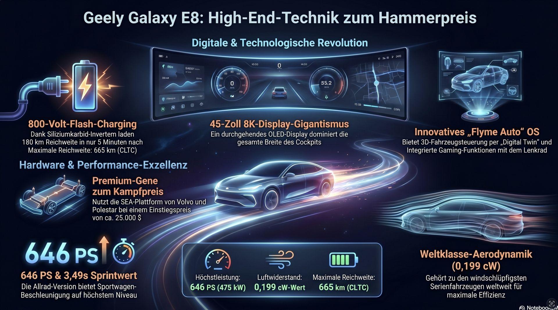 - Effizienz: Nutzt die SEA-Plattform (wie Lotus/Polestar) mit 800V-Technik und erreicht einen CW-Wert von 0,199.