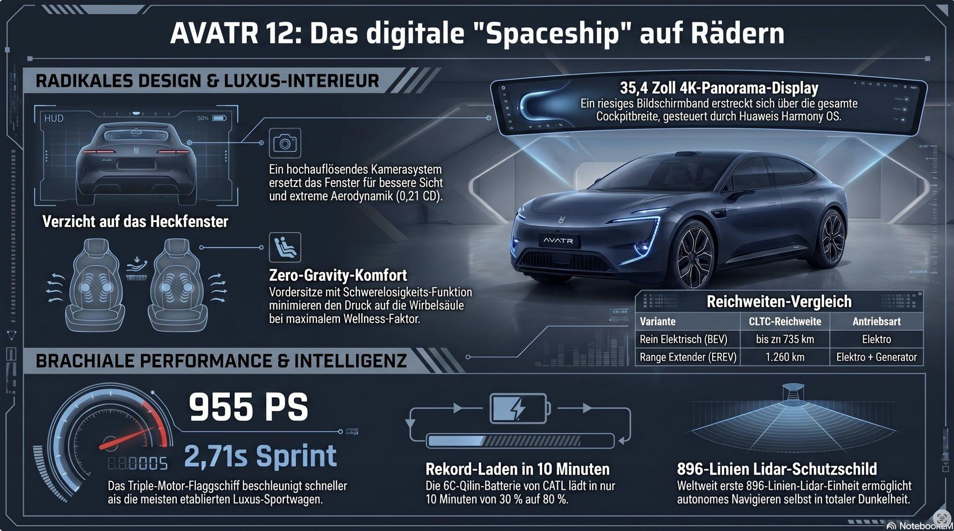 - Interieur: Ein 35,4 Zoll breites 4K-Display, Zero-Gravity-Sitze und eine hochwertige Harmony OS Integration.