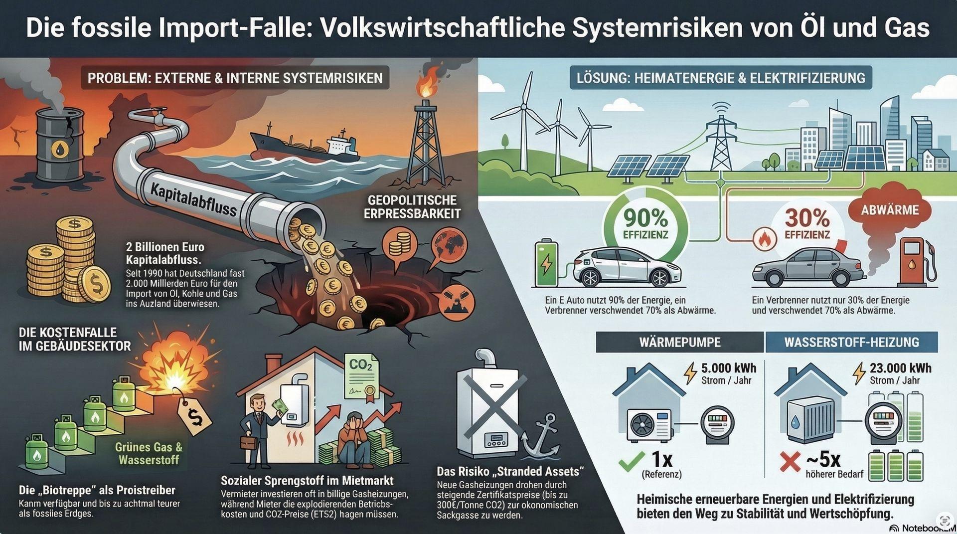 - Wirtschaftlicher Abfluss von Kapital: Deutschland hat seit der Wiedervereinigung fast 2 Billionen Euro für den Import von Öl, Kohle und Gas ausgegeben. Dieses Geld fliesst oft in autokratische Regime (z. B. Katar oder Russland), anstatt im eigenen Land für die Wertschöpfung genutzt zu werden.